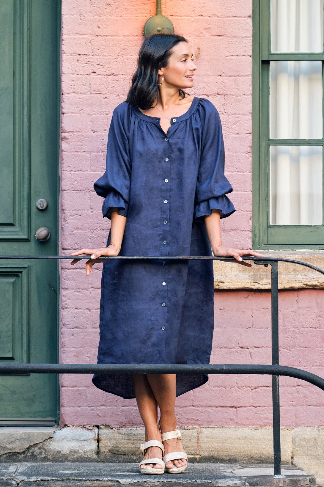 Sandra Linen Long Sleeve Dress Navy Carolina