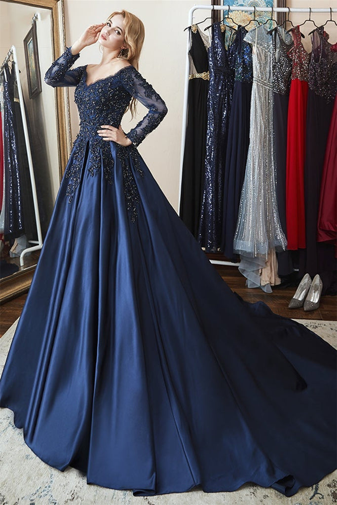 Gorgeous Long Sleeves Navy Blue Lace Beaded Long Prom Dresses V Neck Eip Collection